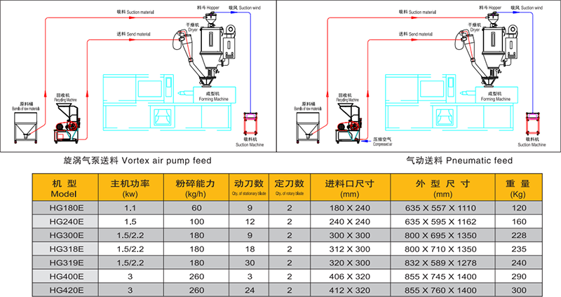 斜進料設計,可回收水口料、型材、片材、薄膜等;